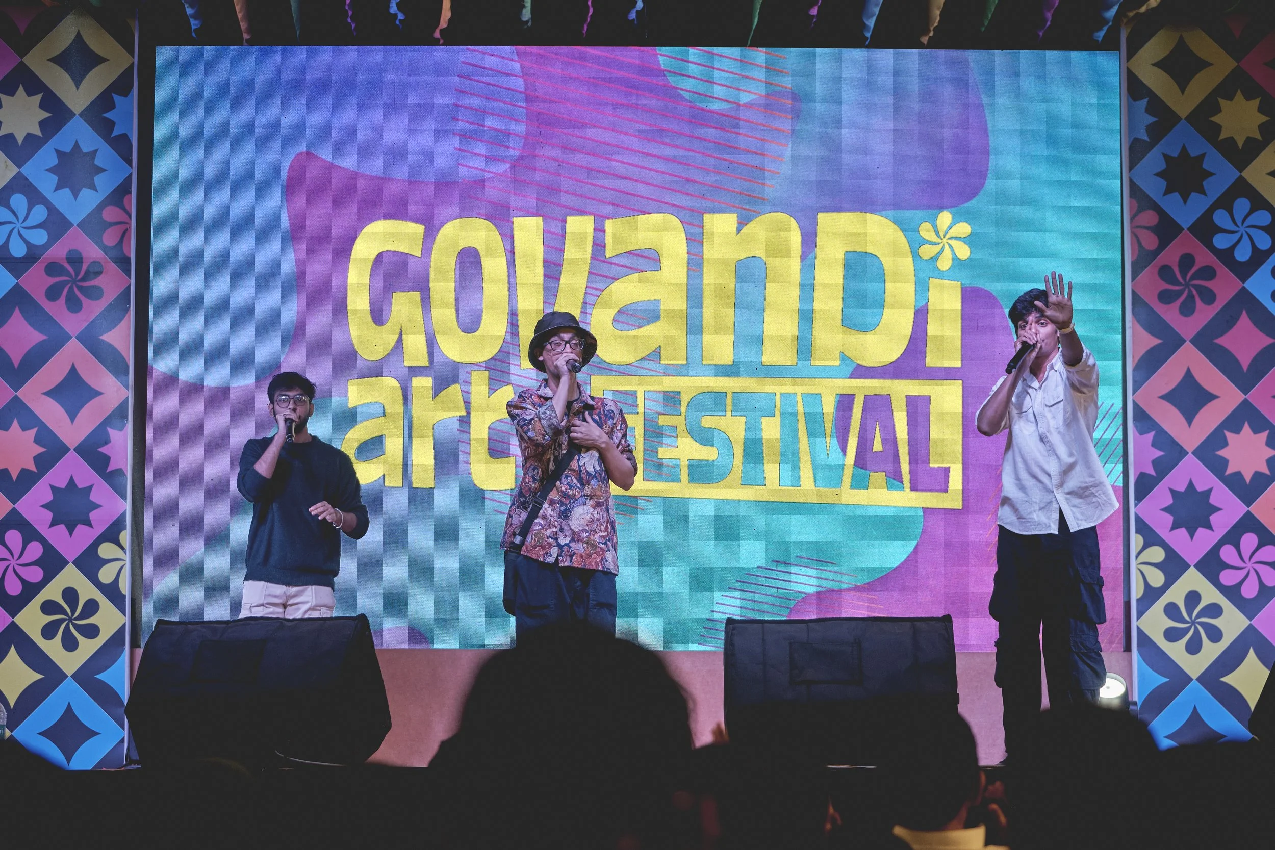 Code 43, a group of four rappers mentored during the Govandi Arts Festival, 2023. Code 43 use rap to express themselves and change the perception of their neighbourhood – often cast as a place of crime and drugs